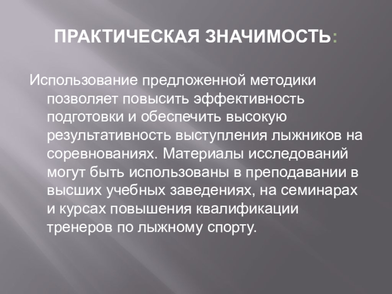 результативность выступления лыжников на соревнованиях. Материалы исследований могут быть использованы в преподавании в высших учебных заведениях, на семинарах и курсах повышения квалификации тренеров по лыжному спорту.