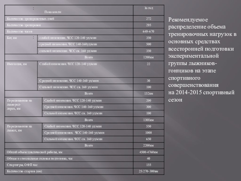 Слайд 10Рекомендуемое распределение объема тренировочных нагрузок в основных средствах всесторонней подготовки экспериментальной