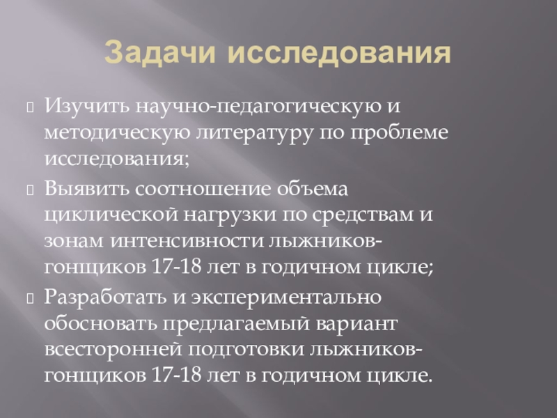 Разработать и экспериментально обосновать предлагаемый вариант всесторонней подготовки лыжников-гонщиков 17-18 лет в годичном цикле.