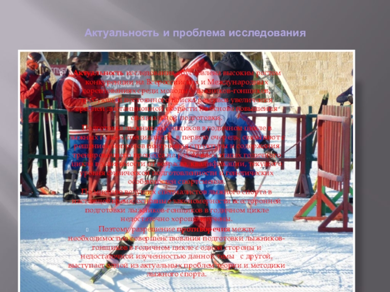 Поэтому разрешение противоречия между необходимостью совершенствования подготовки лыжников-гонщиков в годичном цикле с одной стороны и недостаточной изученностью данной темы с другой, выступает одной из актуальных проблем теории и методики лыжного спорта.