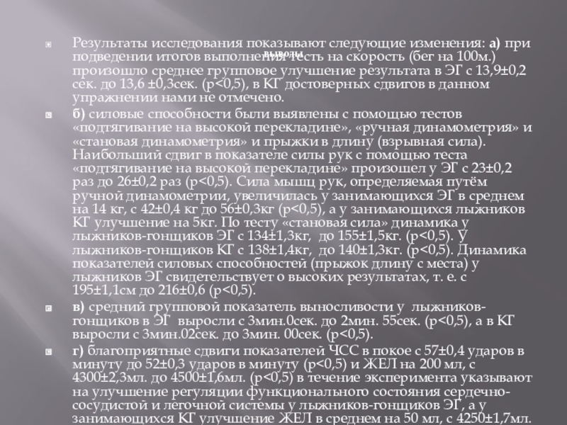 г) благоприятные сдвиги показателей ЧСС в покое с 57±0,4 ударов в минуту до 52±0,3 ударов в минуту (р<0,5) и ЖЕЛ на 200 мл, с 4300±2,3мл. до 4500±1,6мл. (р<0,5) в течение эксперимента указывают на улучшение регуляции функционального состояния сердечно-сосудистой и легочной системы у лыжников-гонщиков ЭГ, а у занимающихся КГ улучшение ЖЕЛ в среднем на 50 мл, с 4250±1,7мл. до 4300±1,4мл. (р<0,5).