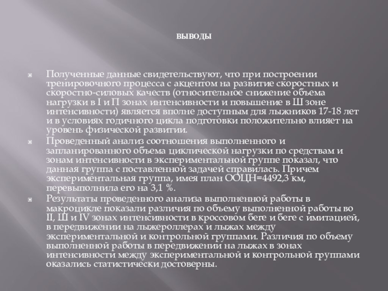 развитие скоростных и скоростно-силовых качеств (относительное снижение объема нагрузки в I и П зонах интенсивности и повышение в Ш зоне интенсивности) является вполне доступным для лыжников 17-18 лет и в условиях годичного цикла подготовки положительно влияет на уровень физической развитии.