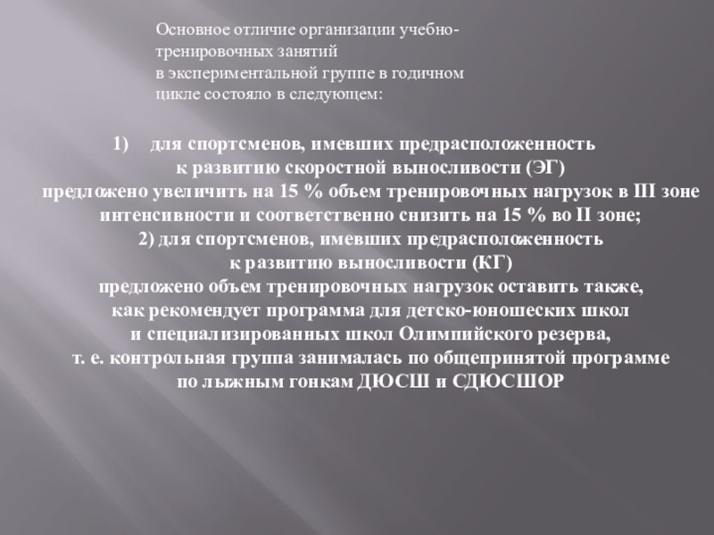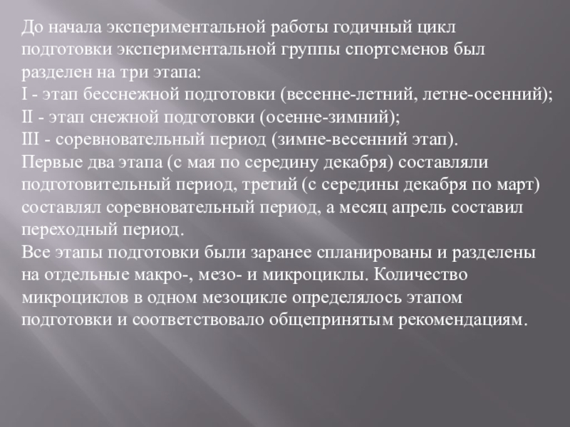 Слайд 9До начала экспериментальной работы годичный цикл подготовки экспериментальной группы спортсменов был