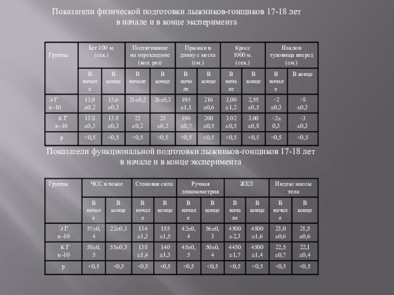 Слайд 8Показатели физической подготовки лыжников-гонщиков 17-18 лет