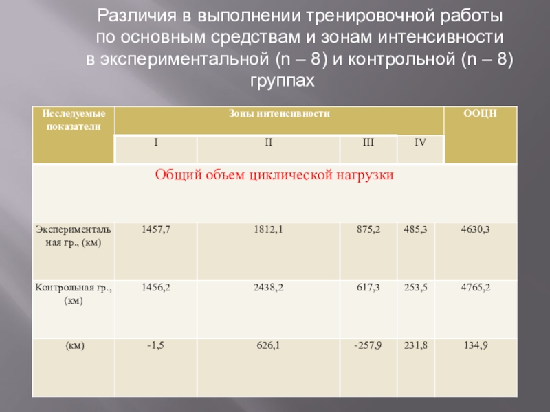 Проведенный анализ соотношения выполненного и запланированного объема циклической нагрузки по средствам и зонам интенсивности в экспериментальной группе показал, что данная группа с поставленной задачей справилась. Причем экспериментальная группа, имея план ООЦН=4492,3 км, перевыполнила его на 3,1 %.