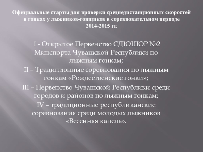 Официальные старты для проверки среднедистанционных скоростей в гонках у лыжников-гонщиков в соревновательном периоде 2014-2015 гг.