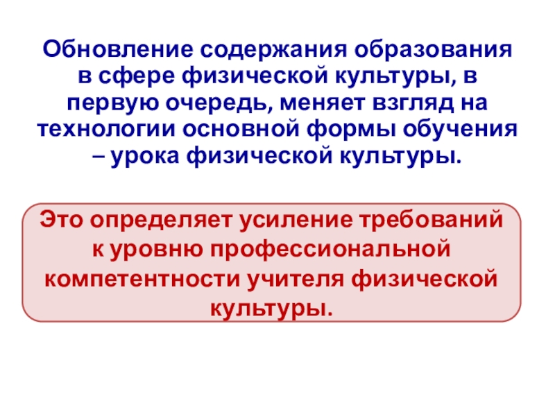 Слайд 4Обновление содержания образования в сфере физической культуры, в первую очередь, меняет