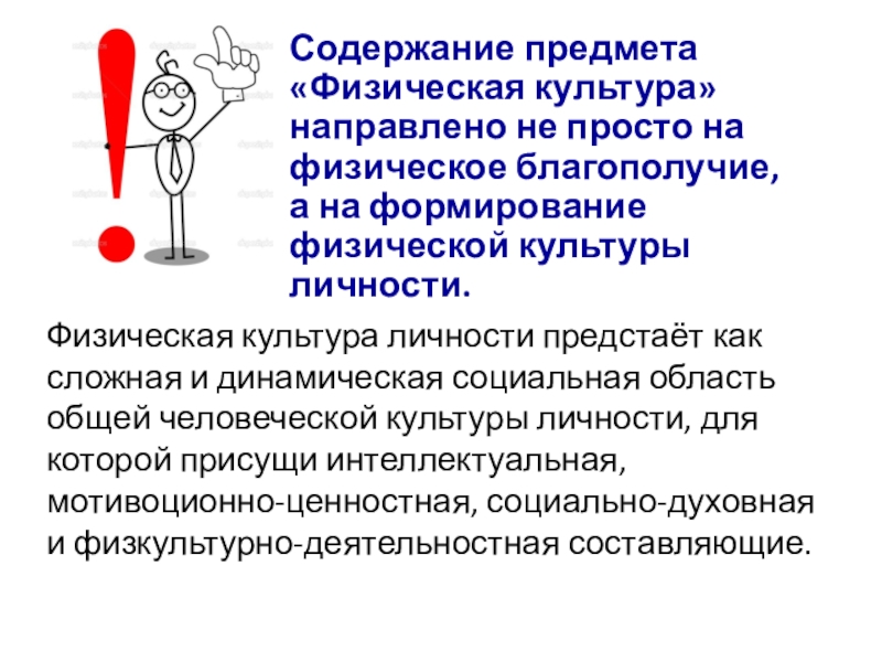 Слайд 5Содержание предмета «Физическая культура» направлено не просто на физическое благополучие, а