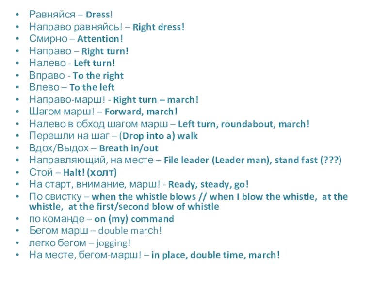 Направляющий, на месте – File leader (Leader man), stand fast (???)