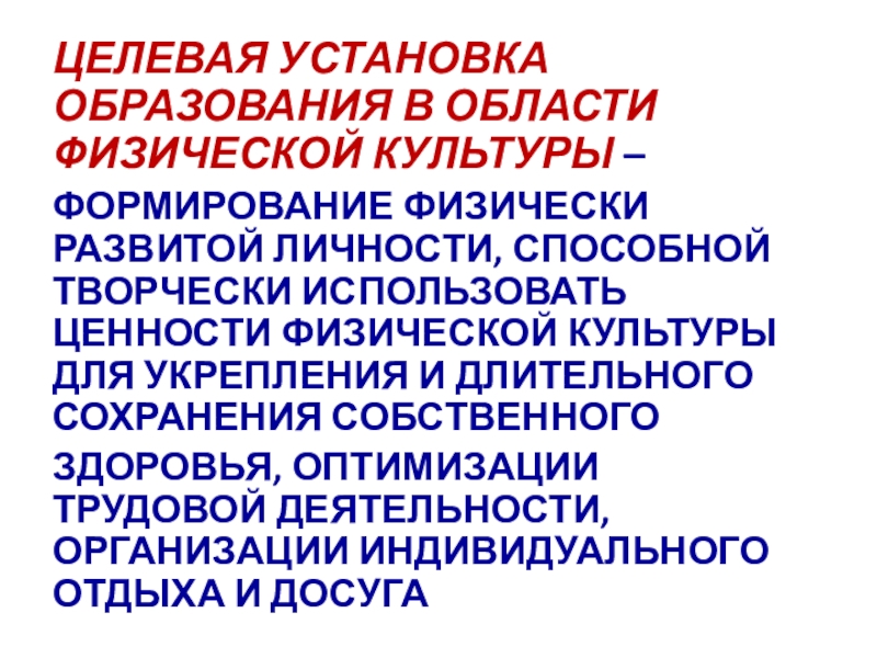 Слайд 2ЦЕЛЕВАЯ УСТАНОВКА ОБРАЗОВАНИЯ В ОБЛАСТИ ФИЗИЧЕСКОЙ КУЛЬТУРЫ –