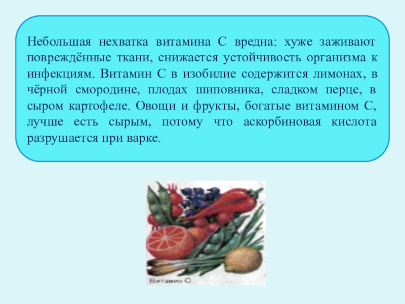 Слайд 7Небольшая нехватка витамина С вредна: хуже заживают повреждённые ткани, снижается устойчивость