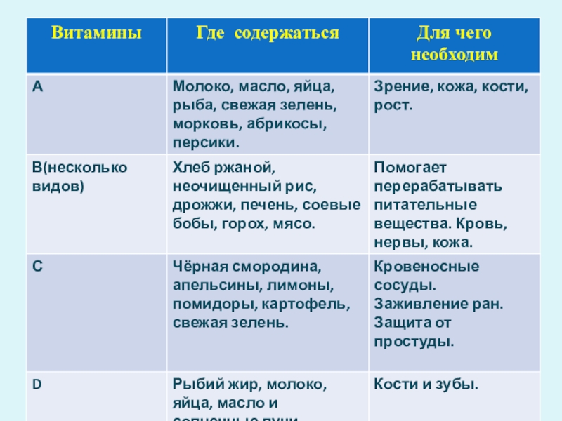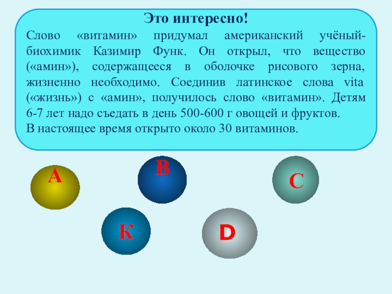 что вещество («амин»), содержащееся в оболочке рисового зерна, жизненно необходимо. Соединив латинское слова vita («жизнь») с «амин», получилось слово «витамин». Детям 6-7 лет надо съедать в день 500-600 г овощей и фруктов.