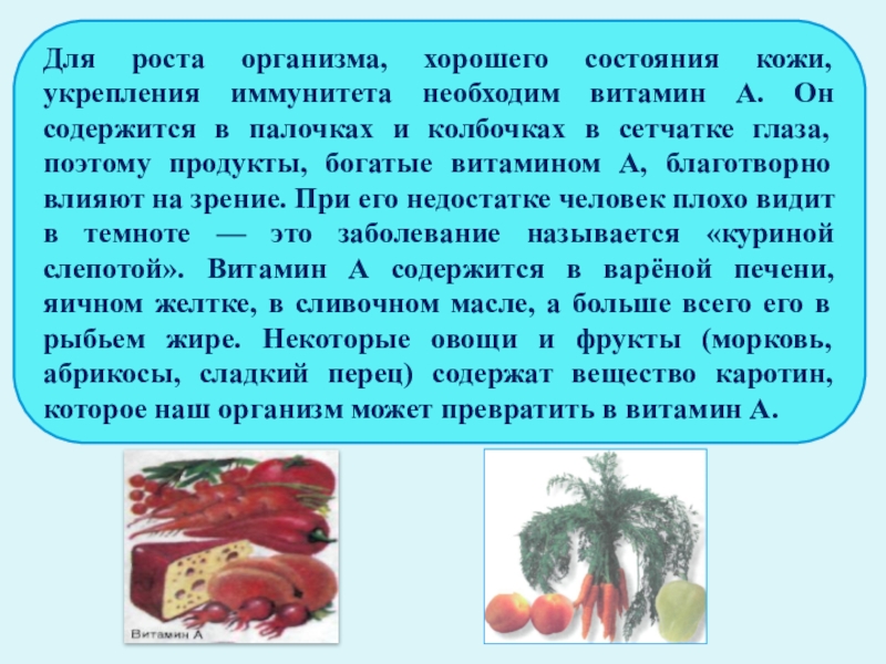 Слайд 5Для роста организма, хорошего состояния кожи, укрепления иммунитета необходим витамин А.