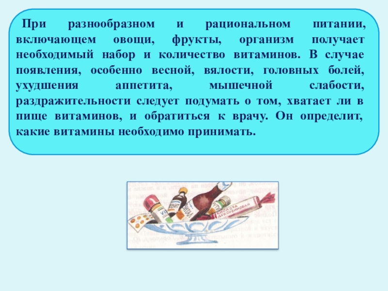 набор и количество витаминов. В случае появления, особенно весной, вялости, головных болей, ухудшения аппетита, мышечной слабости, раздражительности следует подумать о том, хватает ли в пище витаминов, и обратиться к врачу. Он определит, какие витамины необходимо принимать.