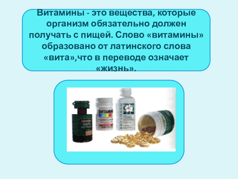 Слово «витамины» образовано от латинского слова «вита»,что в переводе означает «жизнь».