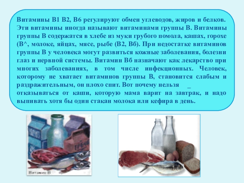 Слайд 6Витамины B1 В2, В6 регулируют обмен углеводов, жиров и белков. Эти