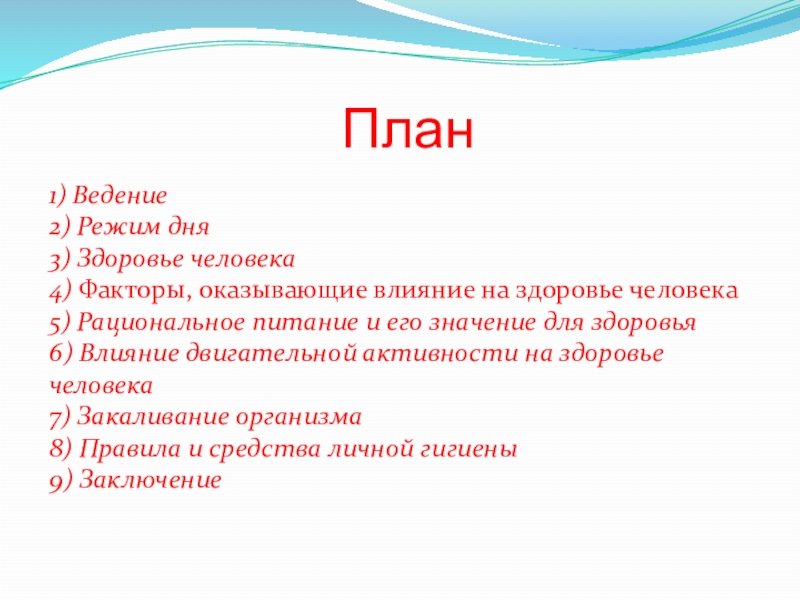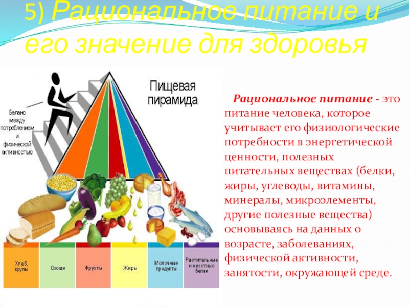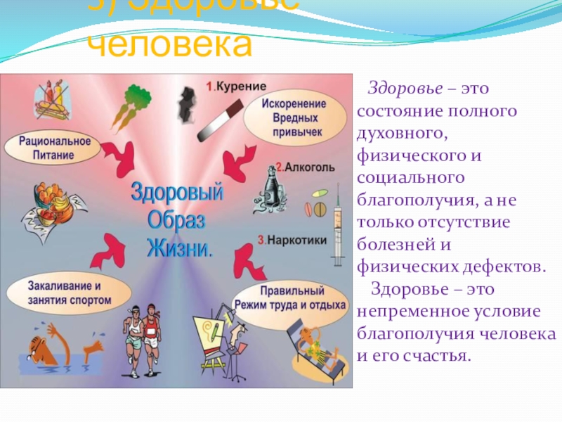 4) Факторы, оказывающие влияние на здоровье человека 5) Рациональное питание и его значение для здоровья