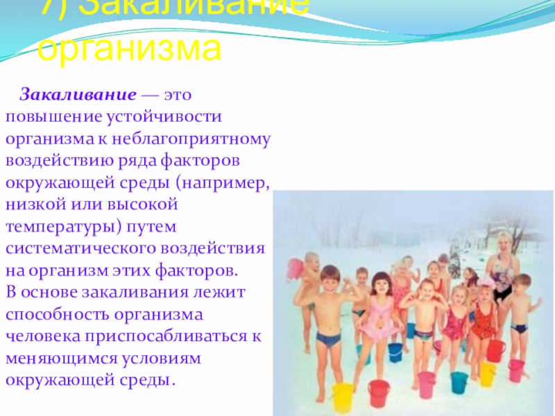 В основе закаливания лежит способность организма человека приспосабливаться к меняющимся условиям окружающей среды.