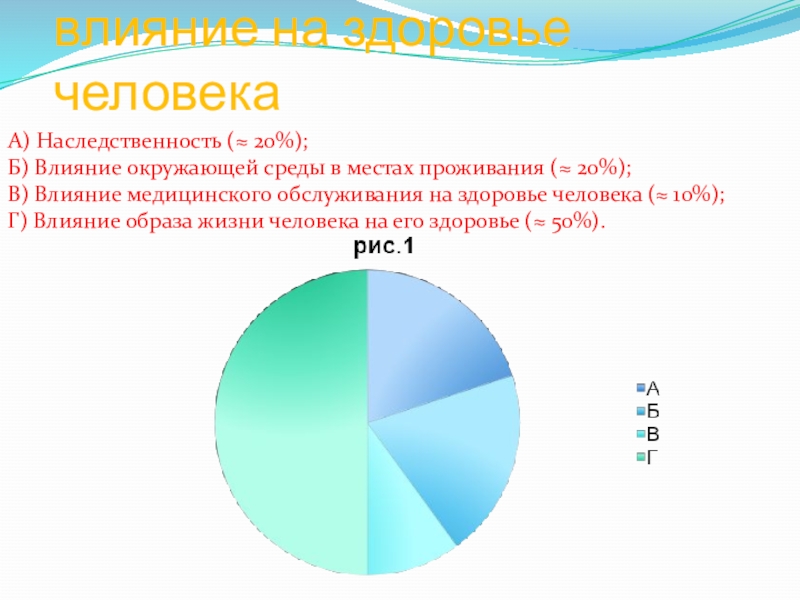 Г) Влияние образа жизни человека на его здоровье (≈ 50%).