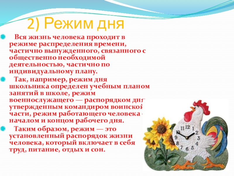 Таким образом, режим — это установленный распорядок жизни человека, который включает в себя труд, питание, отдых и сон.