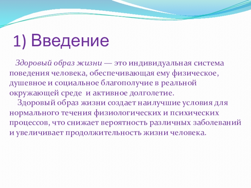 Здоровый образ жизни создает наилучшие условия для нормального течения физиологических и психических процессов, что снижает вероятность различных заболеваний и увеличивает продолжительность жизни человека.