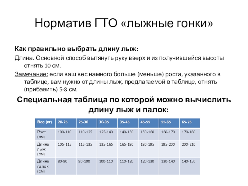 Замечание: если ваш вес намного больше (меньше) роста, указанного в таблице, вам нужно от длины лыж, предлагаемой в таблице, отнять (прибавить) 5-8 см.