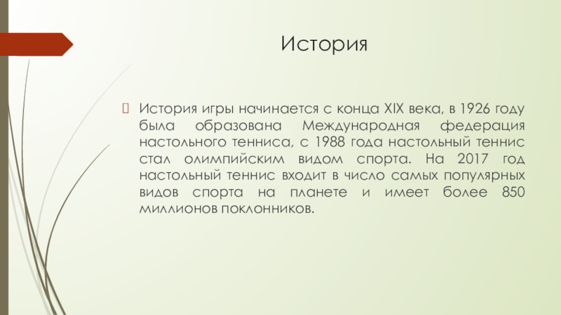 История История игры начинается с конца XIX века, в 1926 году была образована Международная федерация настольного тенниса,