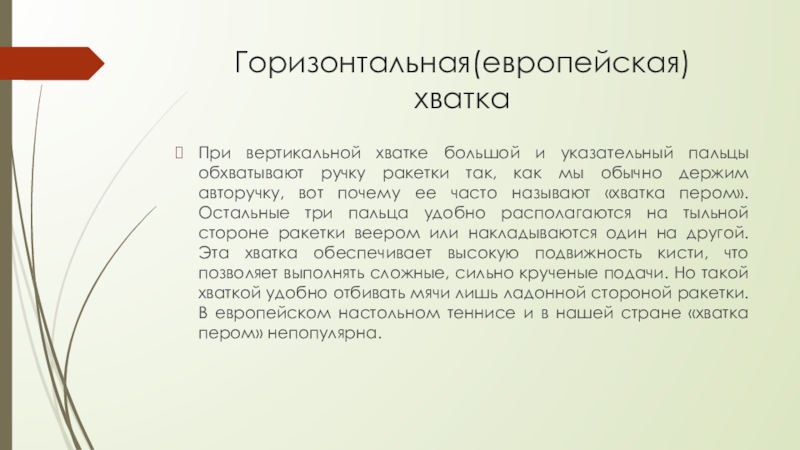 Горизонтальная(европейская) хваткаПри вертикальной хватке большой и указательный пальцы обхватывают ручку ракетки так, как мы обычно держим авторучку,
