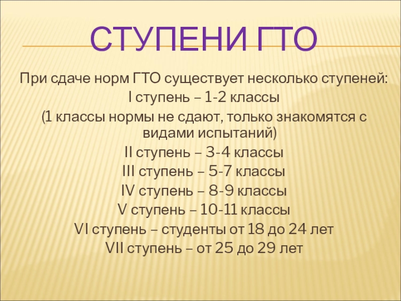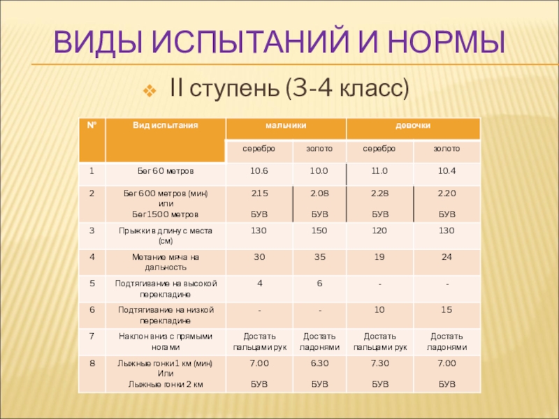 было выполнить заданный набор требований, например: пробежать на скорость 30 метров, подтянуться определённое количество раз, пройти на лыжах 2 км.