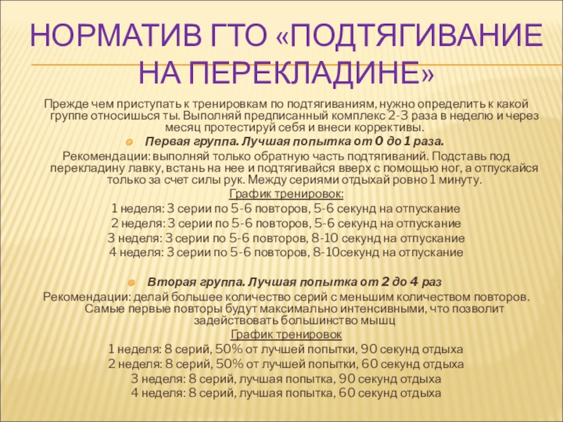 Слайд 9НОРМАТИВ ГТО «ПОДТЯГИВАНИЕ НА ПЕРЕКЛАДИНЕ»