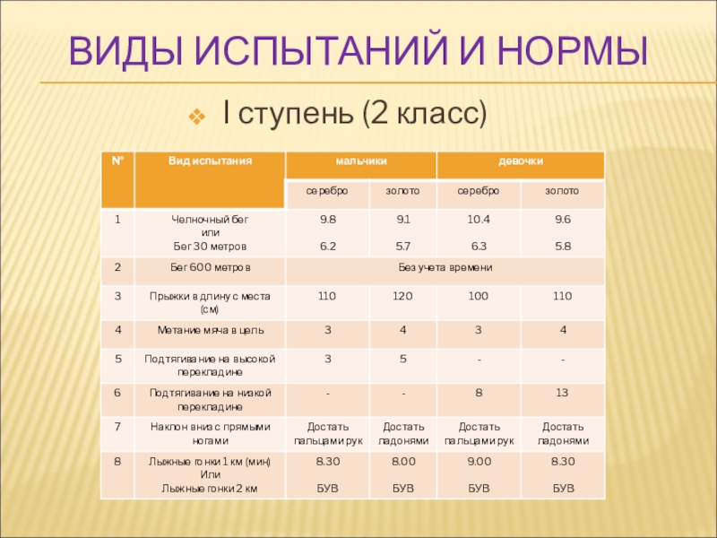 (1 классы нормы не сдают, только знакомятся с видами испытаний)