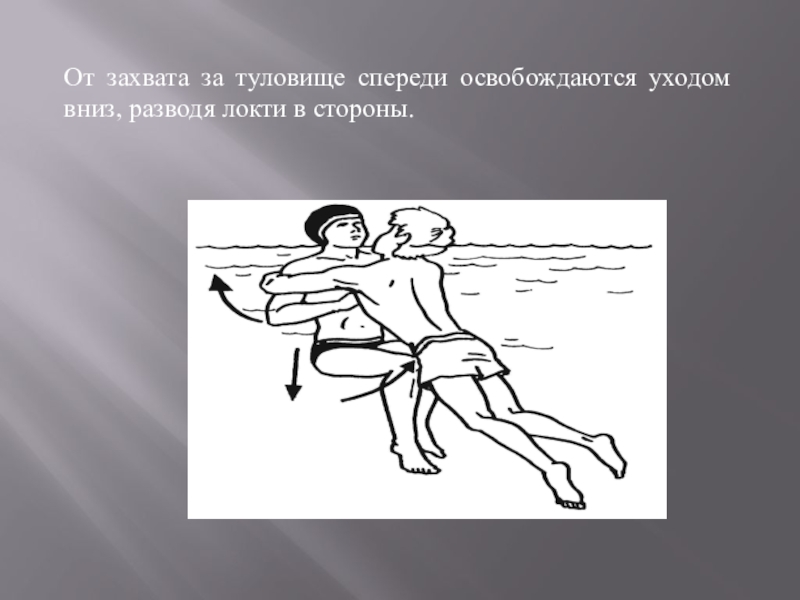 Слайд 12От захвата за туловище спереди освобождаются уходом вниз, разводя локти в