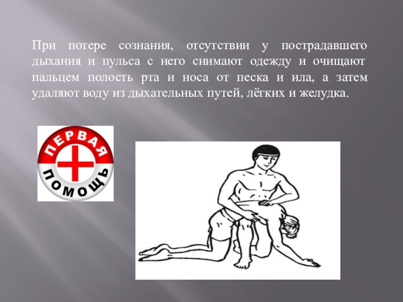 снимают одежду и очищают пальцем полость рта и носа от песка и ила, а затем удаляют воду из дыхательных путей, лёгких и желудка.