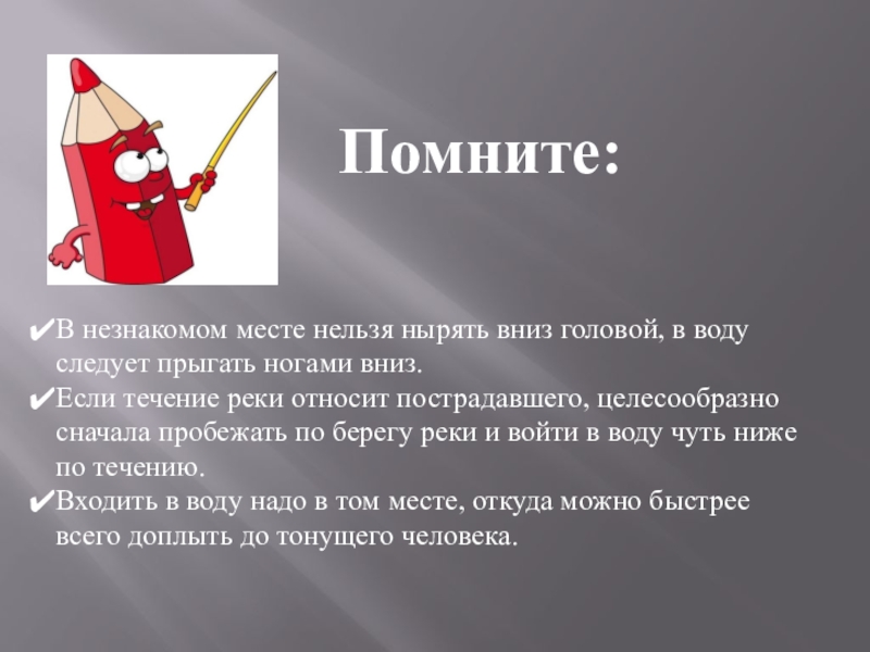 В незнакомом месте нельзя нырять вниз головой, в воду следует прыгать ногами вниз.