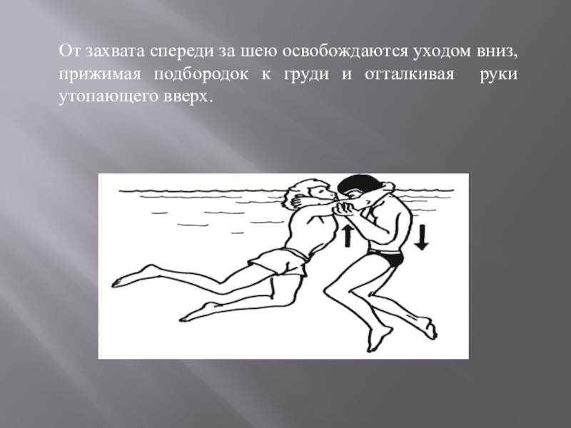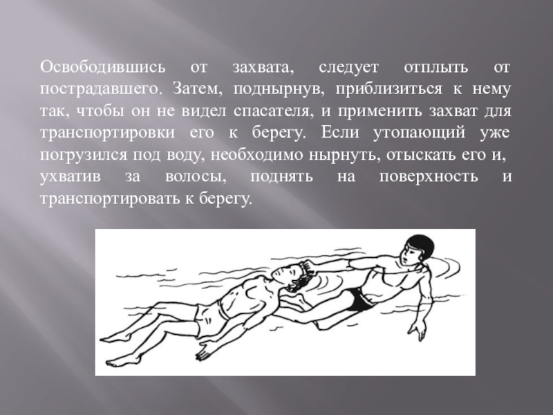 Слайд 16Освободившись от захвата, следует отплыть от пострадавшего. Затем, поднырнув, приблизиться к