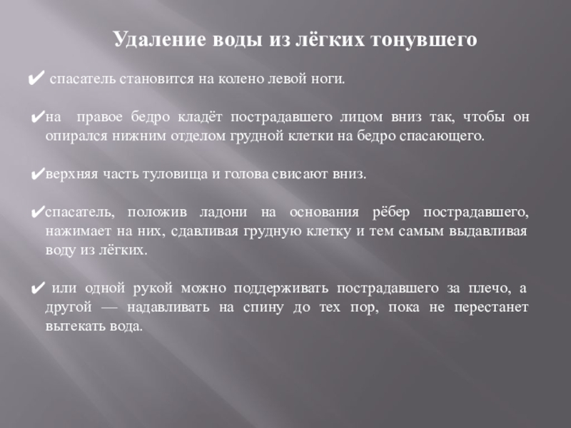 или одной рукой можно поддерживать пострадавшего за плечо, а другой — надавливать на спину до тех пор, пока не перестанет вытекать вода.