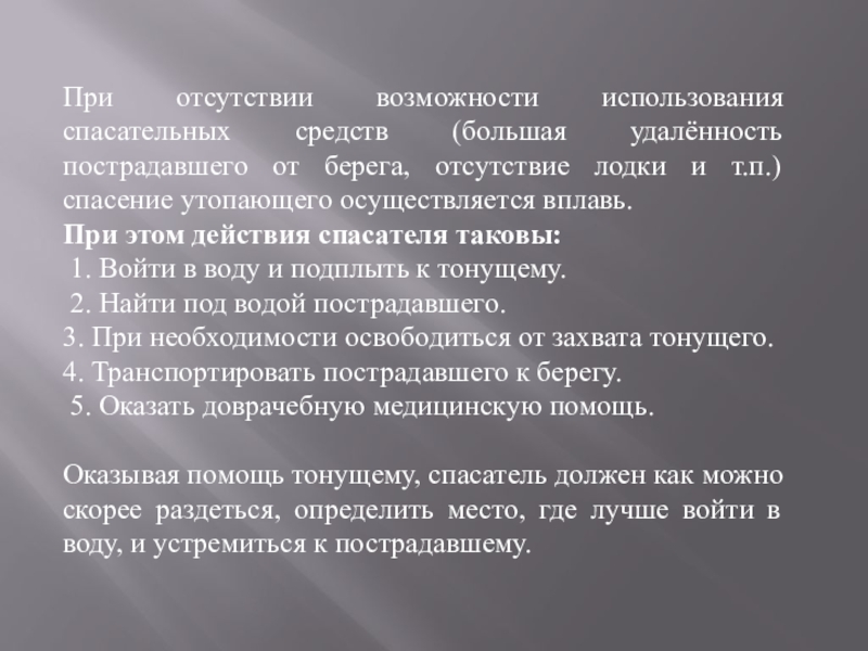 Слайд 6При отсутствии возможности использования спасательных средств (большая удалённость пострадавшего от берега,