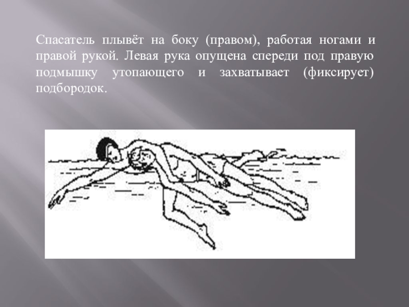 Слайд 19Спасатель плывёт на боку (правом), работая ногами и правой рукой. Левая