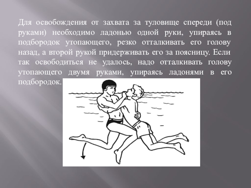 одной руки, упираясь в подбородок утопающего, резко отталкивать его голову назад, а второй рукой придерживать его за поясницу. Если так освободиться не удалось, надо отталкивать голову утопающего двумя руками, упираясь ладонями в его подбородок.