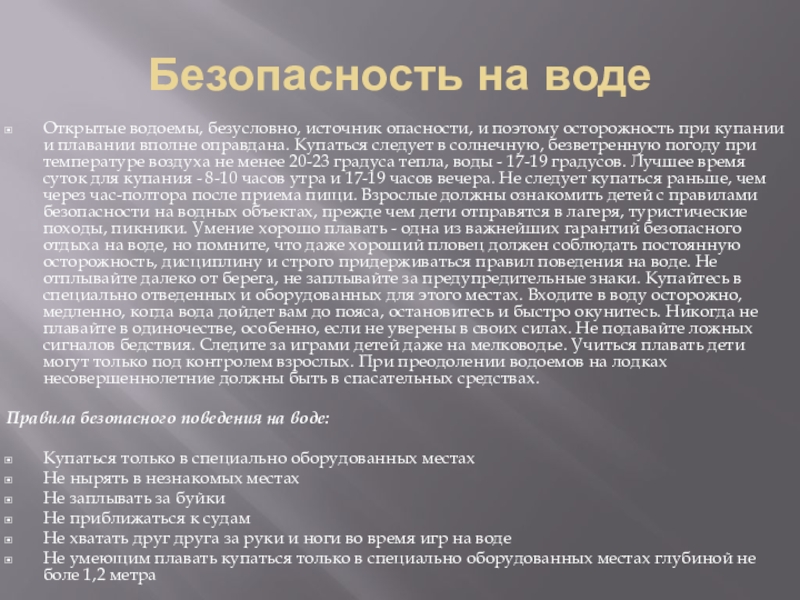 купании и плавании вполне оправдана. Купаться следует в солнечную, безветренную погоду при температуре воздуха не менее 20-23 градуса тепла, воды - 17-19 градусов. Лучшее время суток для купания - 8-10 часов утра и 17-19 часов вечера. Не следует купаться раньше, чем через час-полтора после приема пищи. Взрослые должны ознакомить детей с правилами безопасности на водных объектах, прежде чем дети отправятся в лагеря, туристические походы, пикники. Умение хорошо плавать - одна из важнейших гарантий безопасного отдыха на воде, но помните, что даже хороший пловец должен соблюдать постоянную осторожность, дисциплину и строго придерживаться правил поведения на воде. Не отплывайте далеко от берега, не заплывайте за предупредительные знаки. Купайтесь в специально отведенных и оборудованных для этого местах. Входите в воду осторожно, медленно, когда вода дойдет вам до пояса, остановитесь и быстро окунитесь. Никогда не плавайте в одиночестве, особенно, если не уверены в своих силах. Не подавайте ложных сигналов бедствия. Следите за играми детей даже на мелководье. Учиться плавать дети могут только под контролем взрослых. При преодолении водоемов на лодках несовершеннолетние должны быть в спасательных средствах.