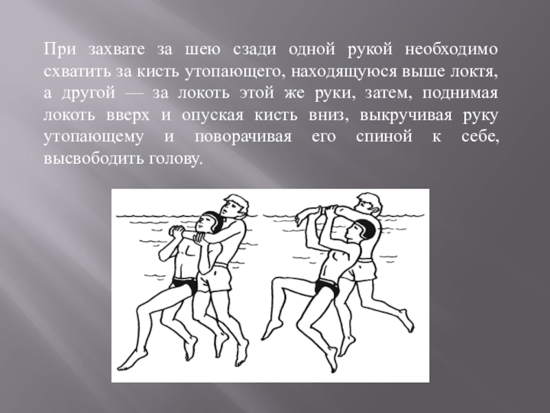 утопающего, находящуюся выше локтя, а другой — за локоть этой же руки, затем, поднимая локоть вверх и опуская кисть вниз, выкручивая руку утопающему и поворачивая его спиной к себе, высвободить голову.
