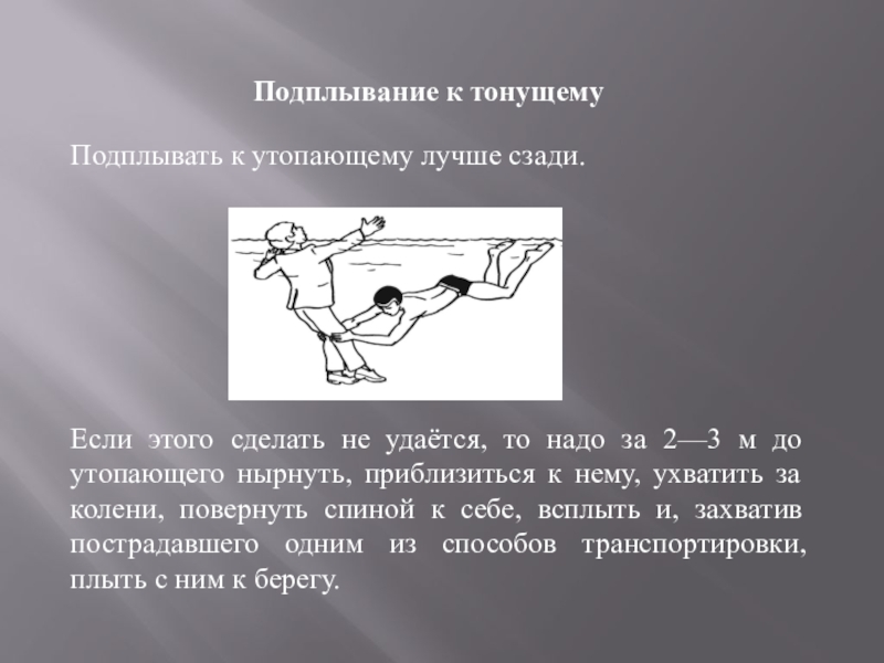 надо за 2—3 м до утопающего нырнуть, приблизиться к нему, ухватить за колени, повернуть спиной к себе, всплыть и, захватив пострадавшего одним из способов транспортировки, плыть с ним к берегу.