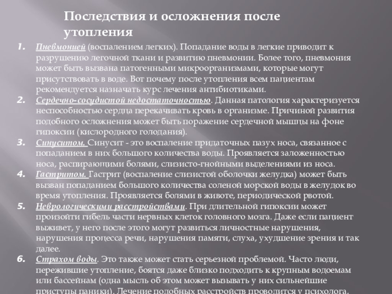 приводит к разрушению легочной ткани и развитию пневмонии. Более того, пневмония может быть вызвана патогенными микроорганизмами, которые могут присутствовать в воде. Вот почему после утопления всем пациентам рекомендуется назначать курс лечения антибиотиками.