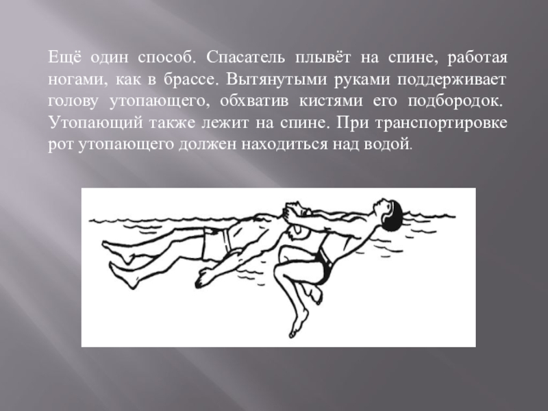 брассе. Вытянутыми руками поддерживает голову утопающего, обхватив кистями его подбородок. Утопающий также лежит на спине. При транспортировке рот утопающего должен находиться над водой.