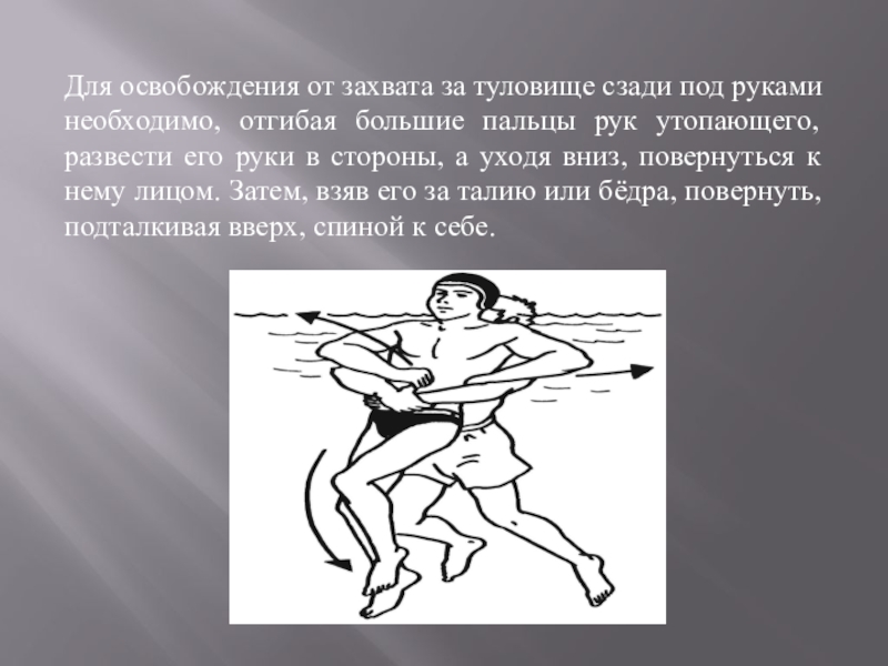 большие пальцы рук утопающего, развести его руки в стороны, а уходя вниз, повернуться к нему лицом. Затем, взяв его за талию или бёдра, повернуть, подталкивая вверх, спиной к себе.