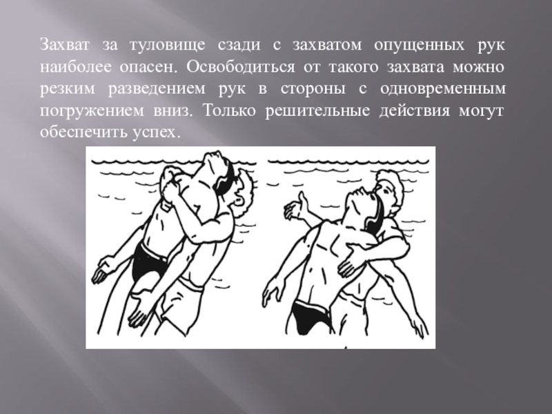 Слайд 14Захват за туловище сзади с захватом опущенных рук наиболее опасен. Освободиться