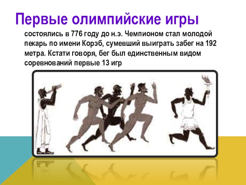 Первые олимпийские игры состоялись в 776 году до н.э. Чемпионом стал