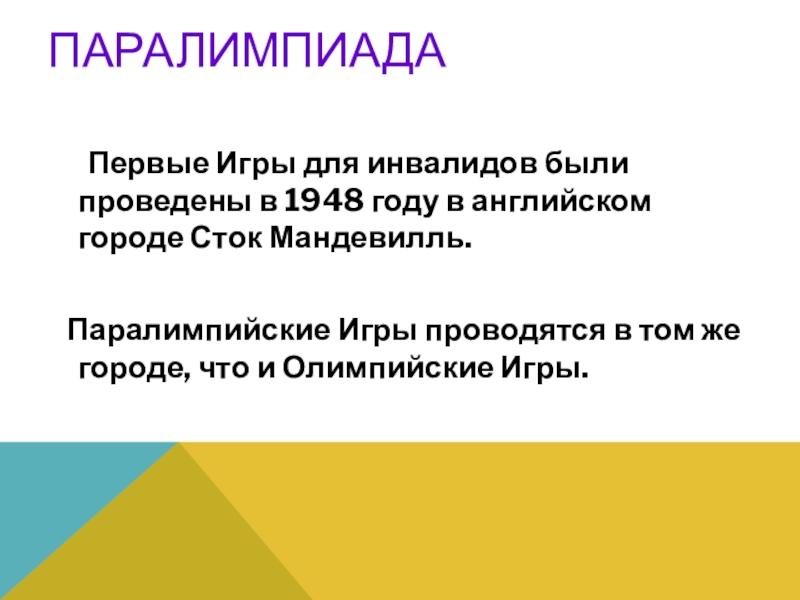 Первые Игры для инвалидов были проведены в 1948 году в английском городе