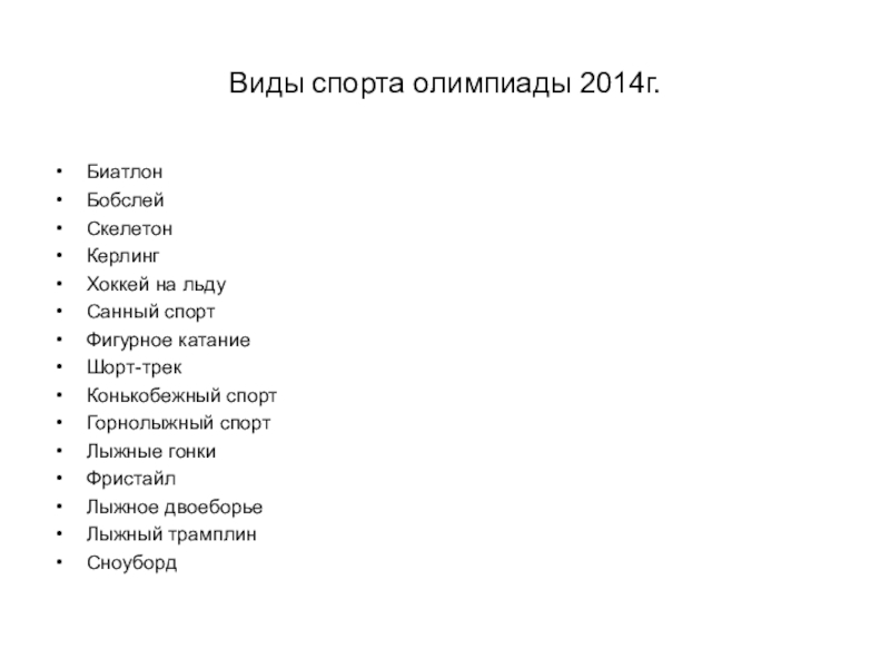 Виды спорта олимпиады 2014г.БиатлонБобслейСкелетонКерлингХоккей на льдуСанный спортФигурное катаниеШорт-трекКонькобежный спортГорнолыжный спортЛыжные гонкиФристайлЛыжное двоеборьеЛыжный трамплинСноуборд