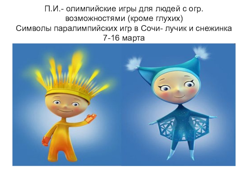 П.И.- олимпийские игры для людей с огр. возможностями (кроме глухих) Символы паралимпийских игр в Сочи- лучик и
